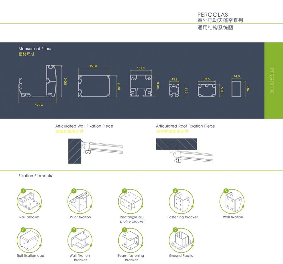 Pergola s odnímatelným střešním systémem je design se čtyřmi typickými možnostmi designu. Nejvýhodnější variantou je volně stojící se 4 nebo více sloupky pro nastavení žaluzického střešního systému. Další 3 možnosti jsou běžně vidět, když chcete začlenit pergolu do stávající struktury budovy. Lidé si mohou vybrat jednu z možností podle svých instalačních palcí. Je ideální pro ochranu před sluncem a deštěm na místech, jako je dvorek, paluba, zahrada nebo bazén.